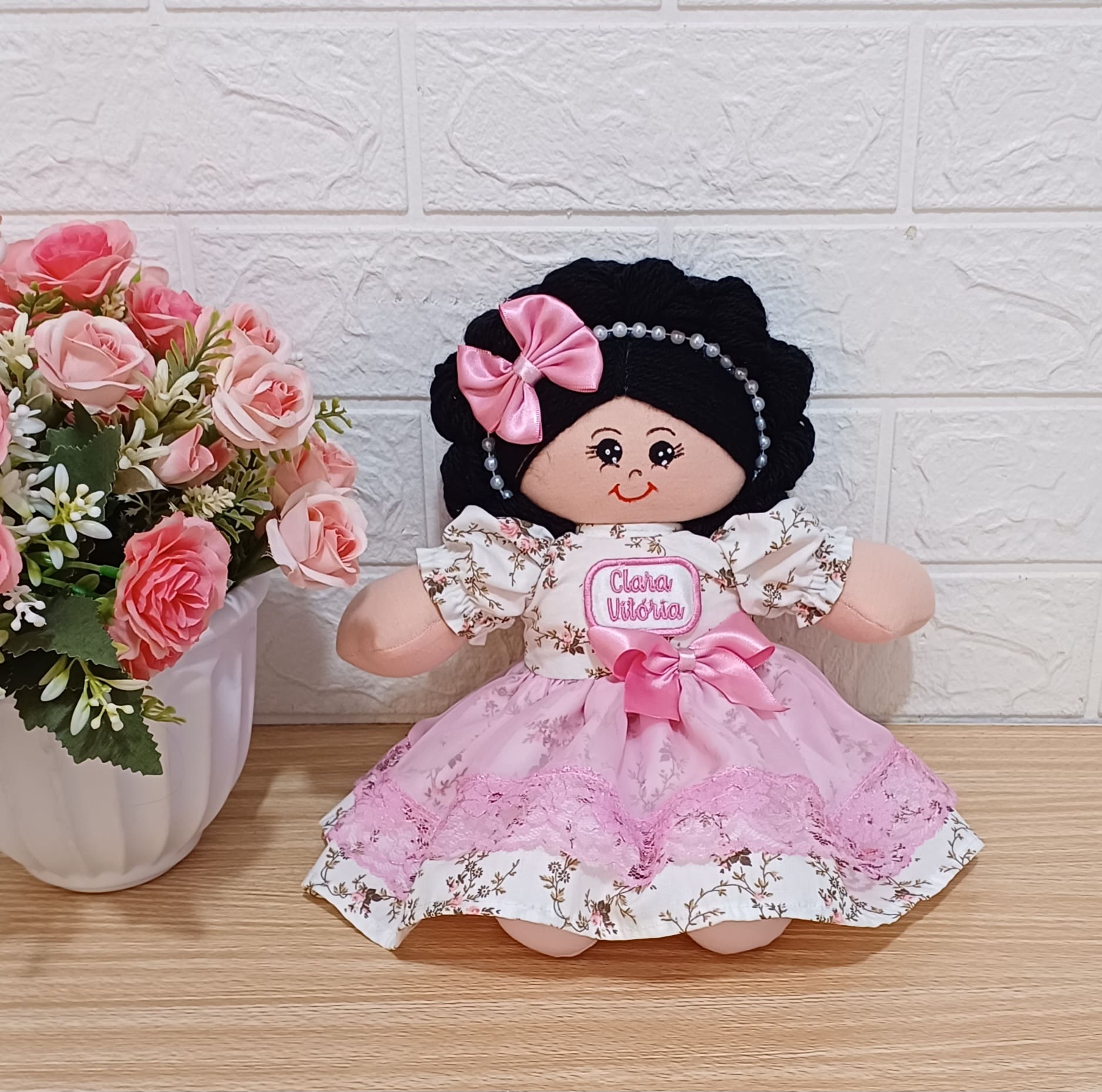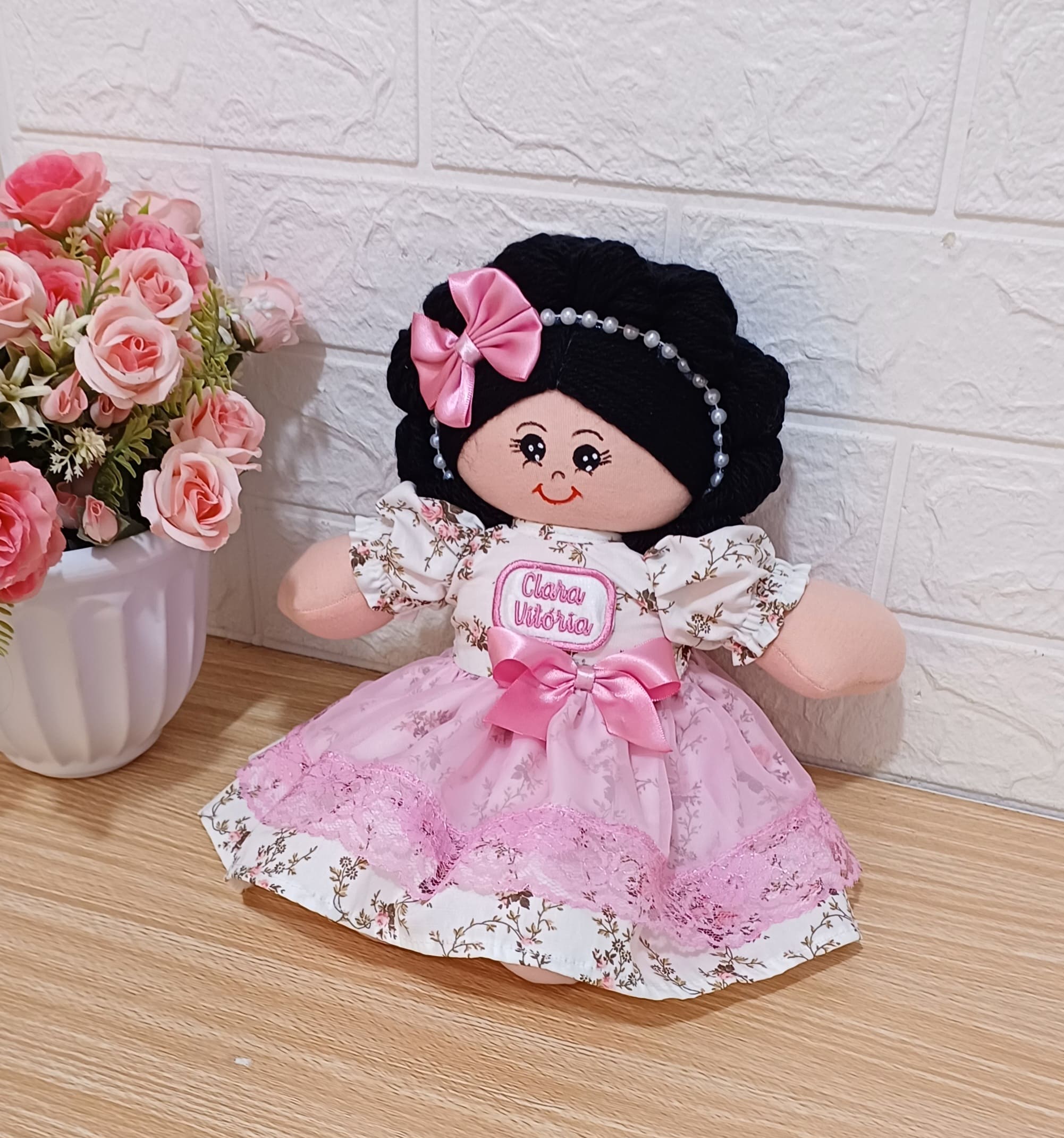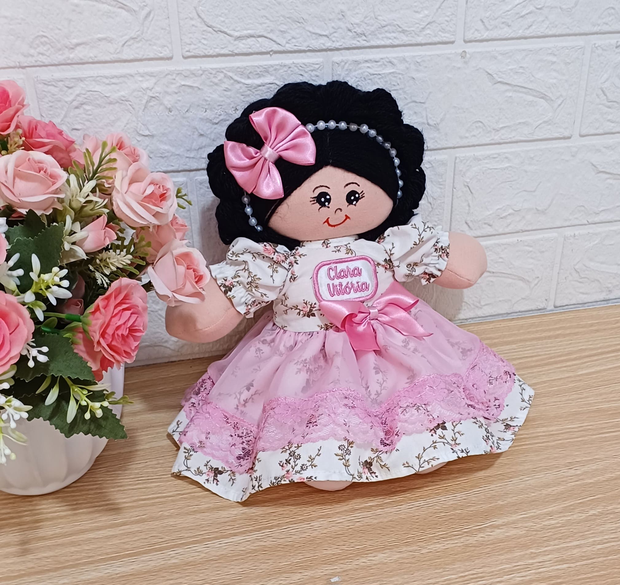 A boneca mede 30cm, após a compra entrar em contato através do whatsapp para informar o nome que será bordado e ver a disponibilidade dos tecidos.
