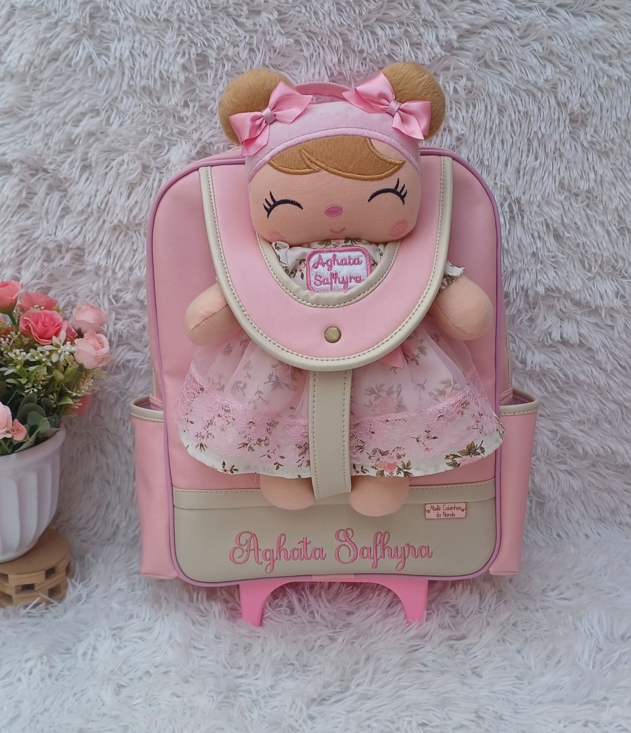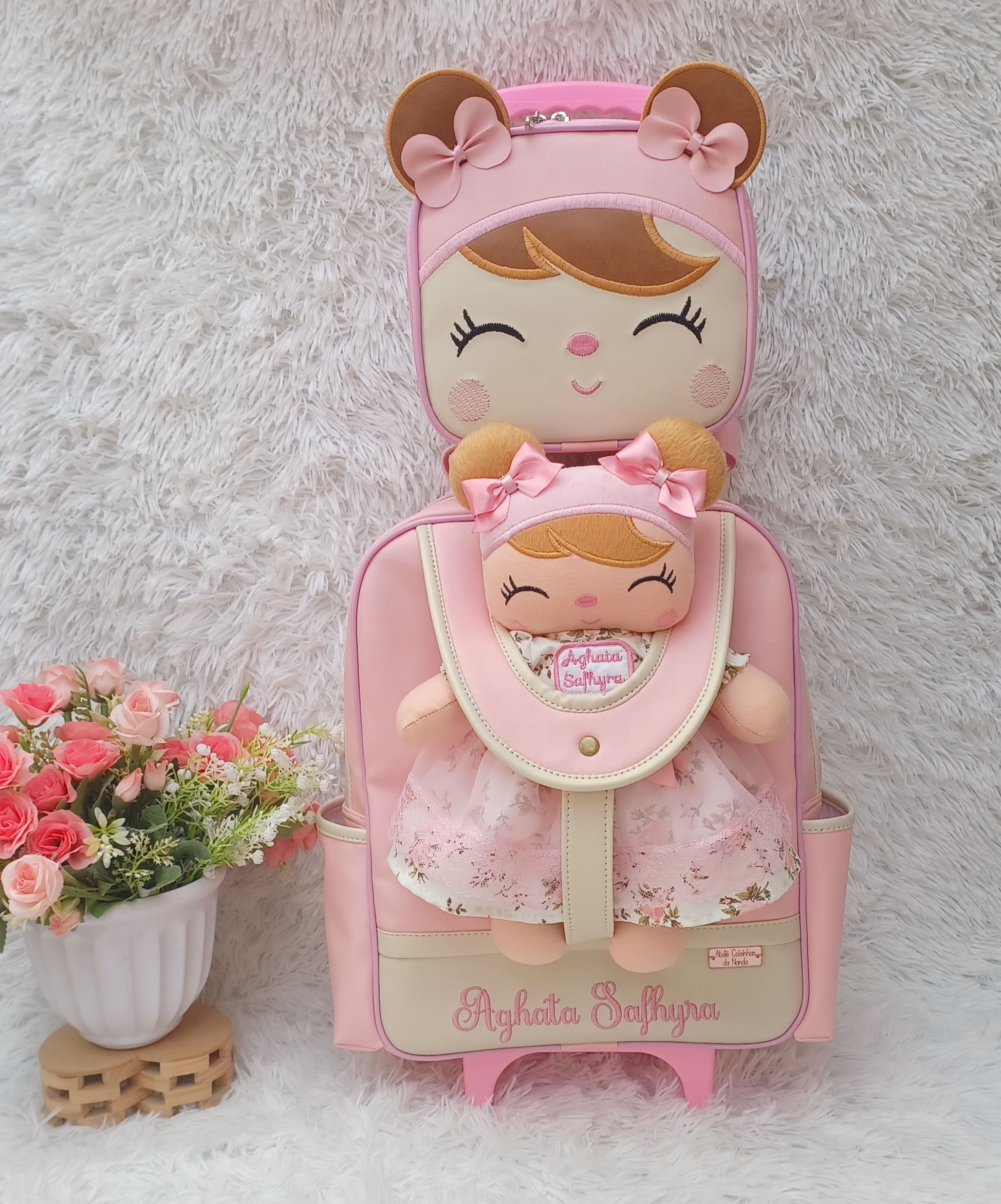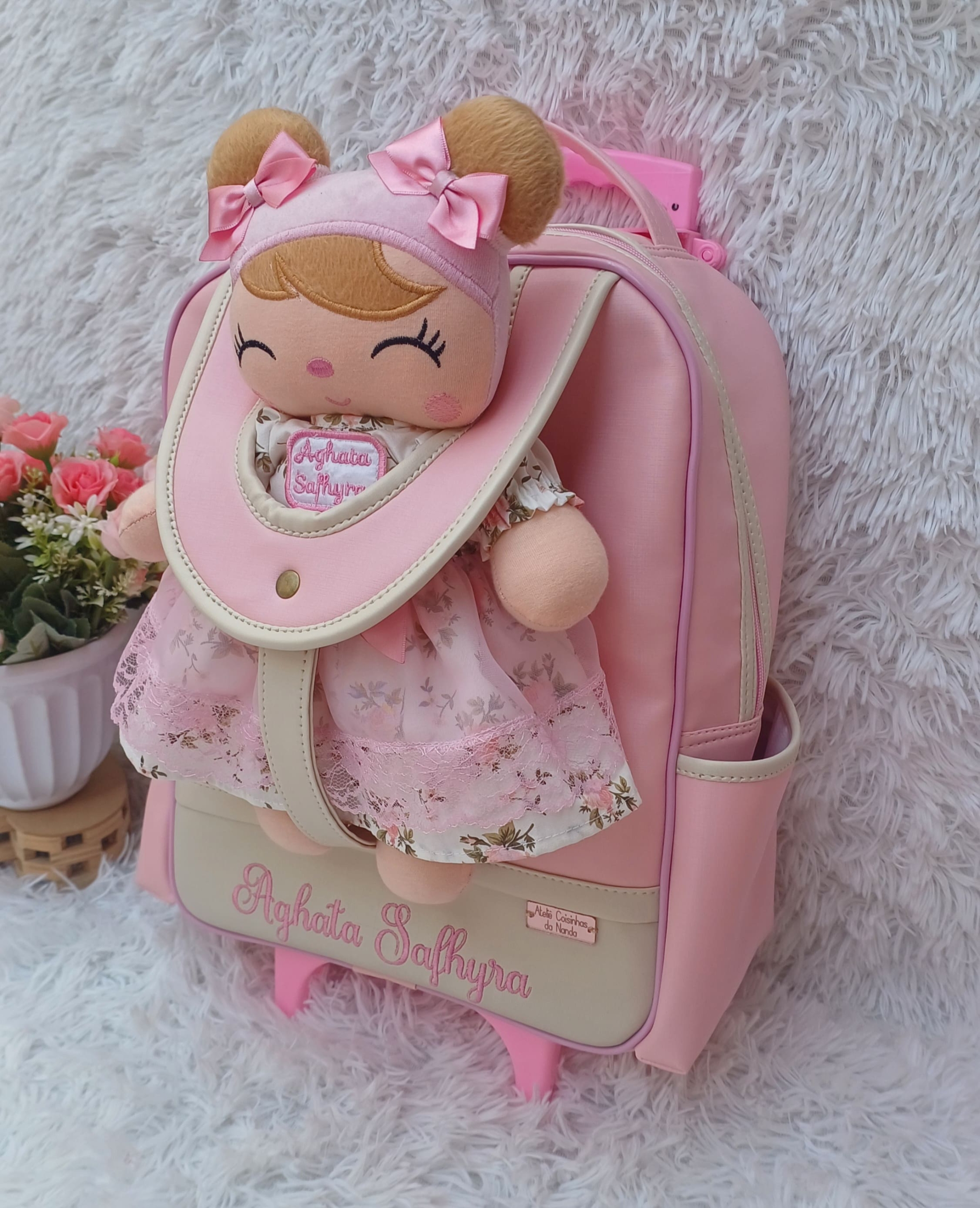 1 Mochila tamanho M (Mede 38cm altura x 30cm largura x 15cm de profundidade) acompanha a boneca.